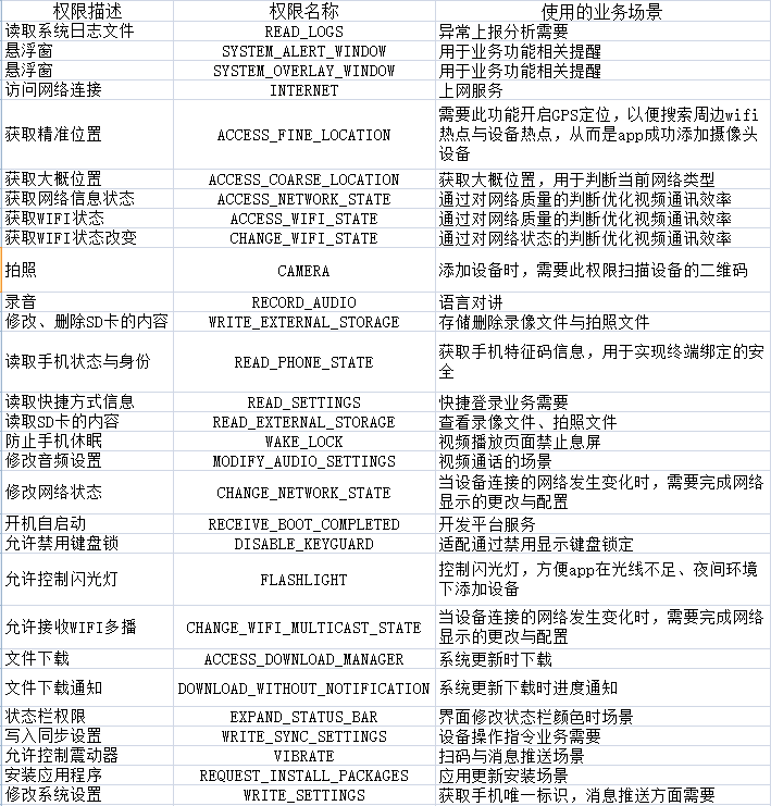 (c) 在您使用本应用与配套的网络摄像机硬件时,本应用需要您授权访问手机硬件以下信息,您也可以选择拒绝,但是您将无法正常使用对应的功能: